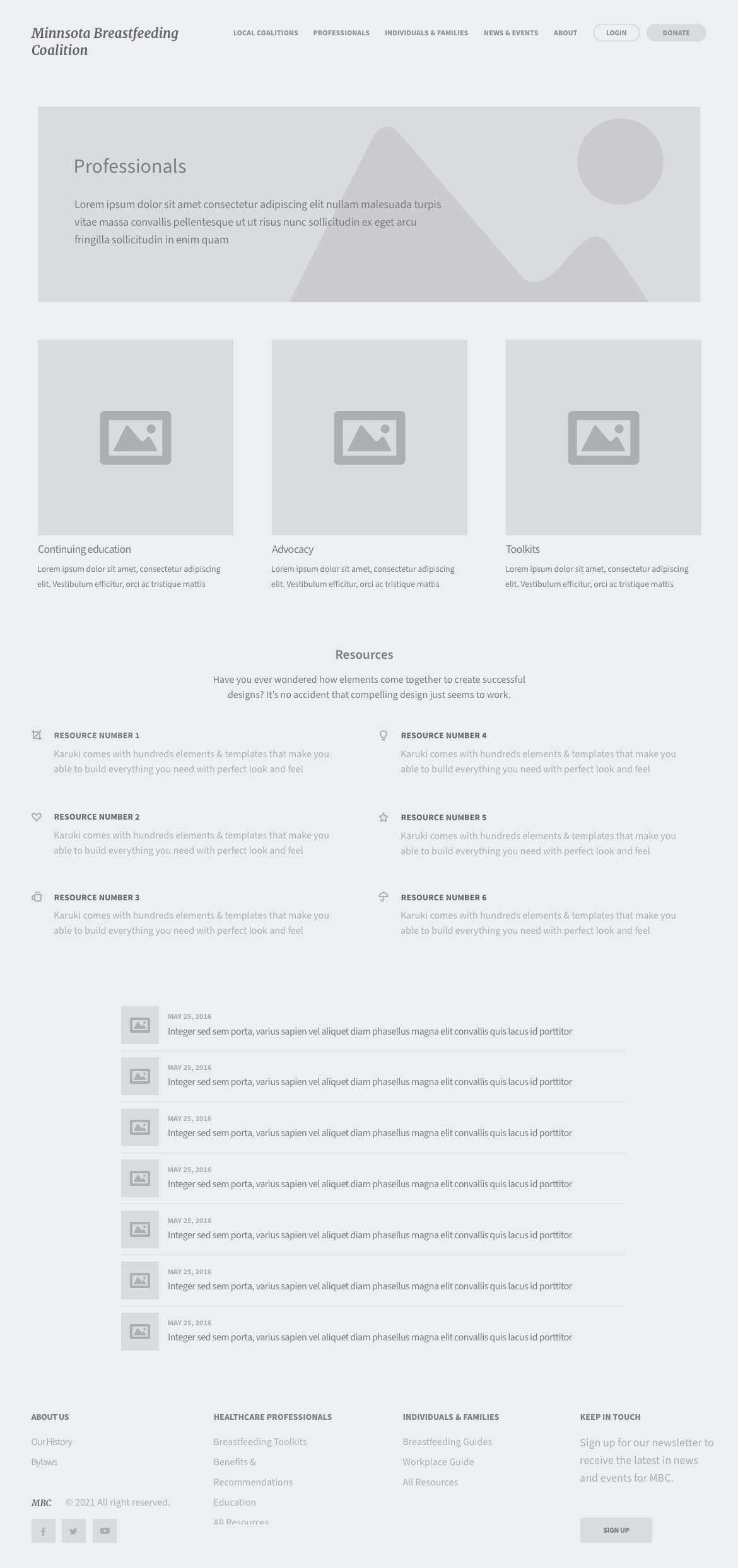 The Minnesota Breastfeeding Coalition (MBC) is looking for a brand and website refresh. I am working with a strategist who did a site and content audit and created aN INITIAL user flow/sitemap. I am tasked to complete the UX, website design and brand refresh AS WELL AS helping to REFINE THE USER flow/sitemap.