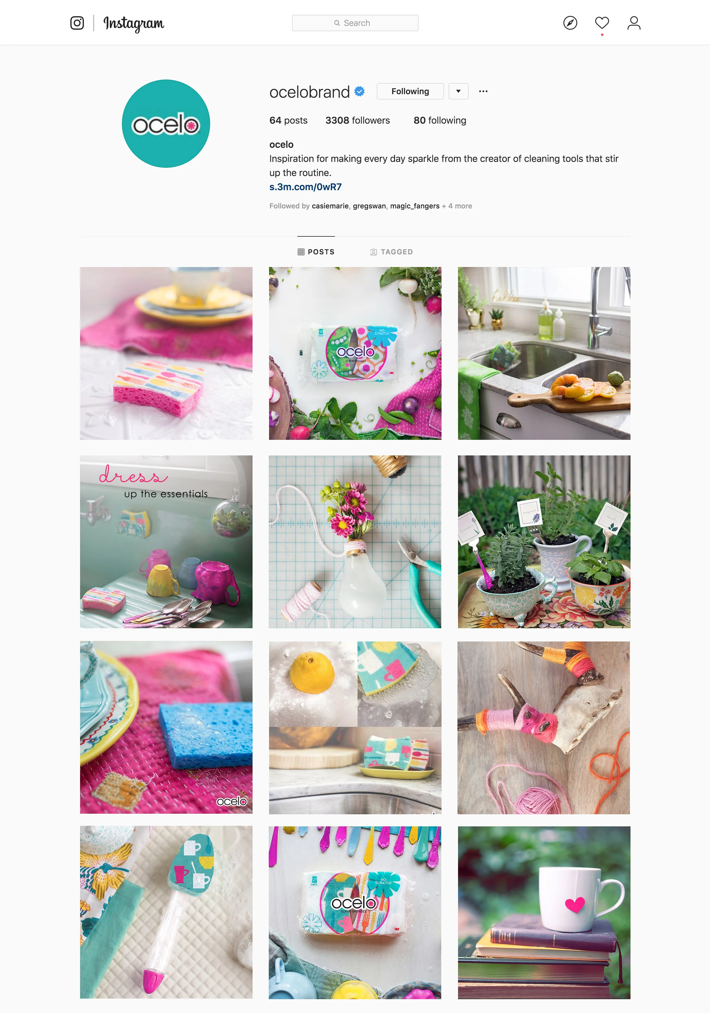 Website design & visual brand direction for 3M’s ocelo sponge brand. Created all content and built social media presence from nothing on Pinterest, Instagram, Facebook & Twitter.